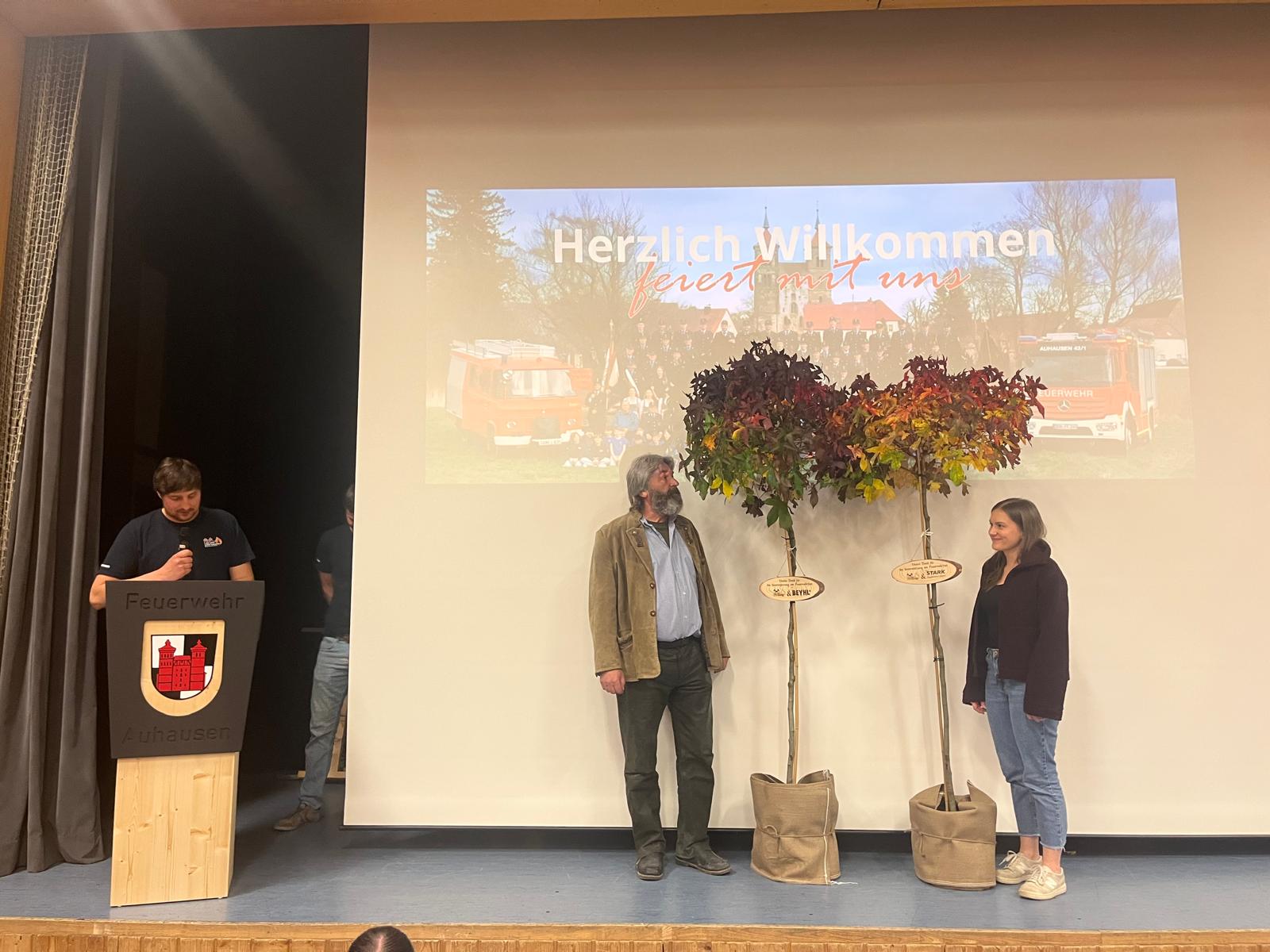 Beide Firmen erhielten als Dankeschön jeweils einen Baum, der an ihre besondere, generationsübergreifende Verbundenheit mit der Feuerwehr Auhausen erinnern soll. Überreicht wurden die Bäume mit den Worten: „Wir haben für euch jeweils einen Baum als Geschenk – ein Symbol für Langlebigkeit, Nachhaltigkeit und Beständigkeit. Bäume wachsen über viele Jahrzehnte und Generationen hinweg – so wie euer Engagement für unsere Feuerwehr.“